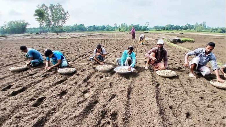 নীলফামারীতে আগাম আলু রোপণে ব্যস্ত চাষিরা।