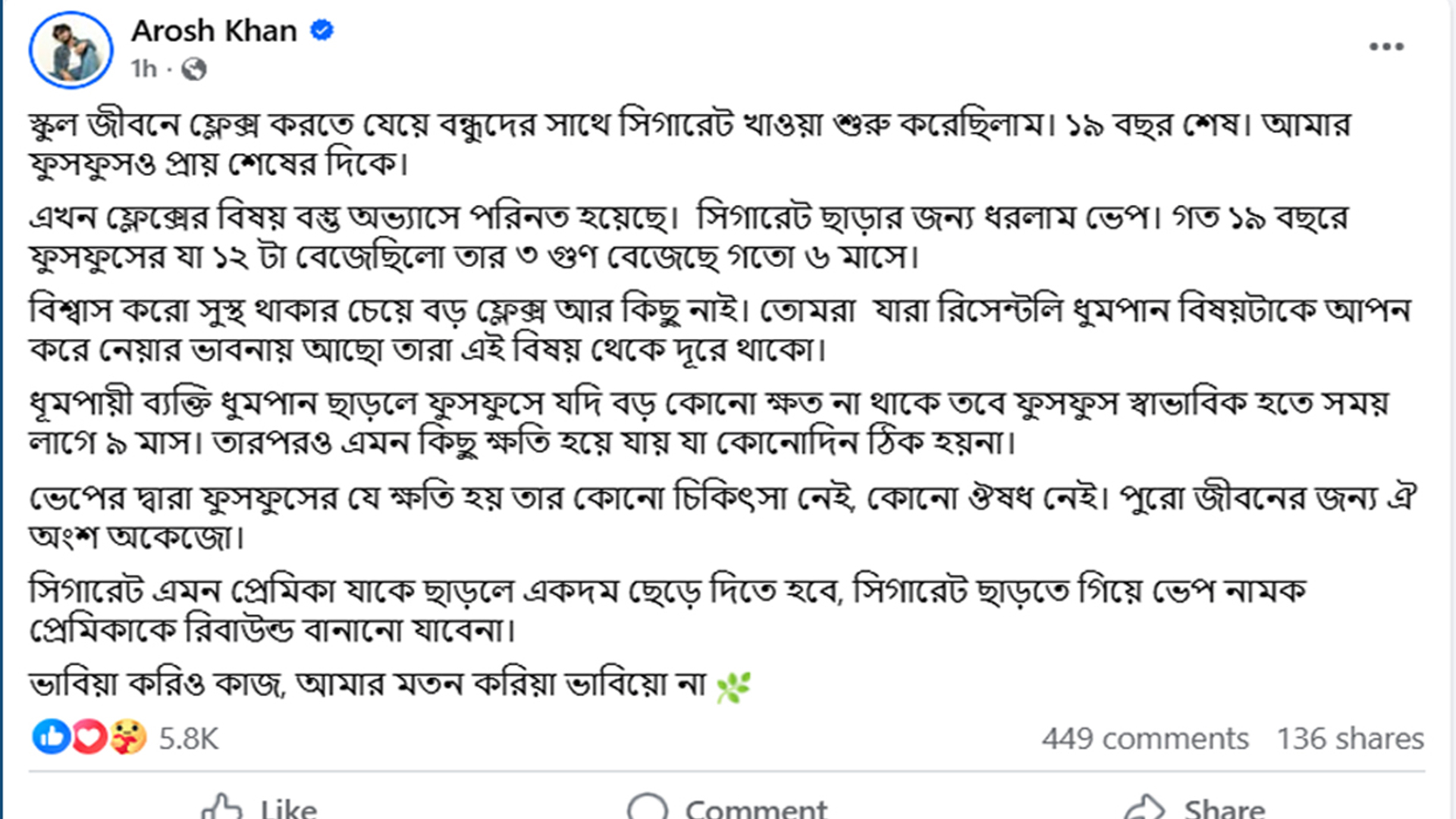 ছোট পর্দার জনপ্রিয় অভিনেতা আরশ খান সম্প্রতি নিজের ফেসবুক পেজে সিগারেট ও ভেপ নিয়ে সতর্কবার্তা দিয়েছেন। তার পোস্ট মুহূর্তে ভাইরাল হয়েছে।